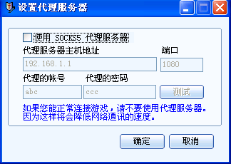 在“代理服务器地址”中输入Socks5代理服务器的IP地址。 3)在端口中输代理服务的端口,一般是1080。 4)如果代理服务器需要身份验证,则输入“代理的帐号”与“代理的密码”,否则请留空。 5)然后按“测试”按钮测试代理服务器是否工作正常 6)如果代理服务器工作正常,则按“确定”按钮返回登录窗口。 |