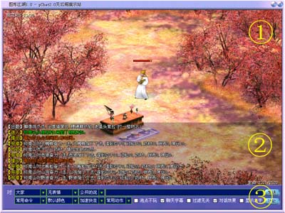 上面为游戏显示区(图中1的位置)和聊天字幕(图中2的位置)。 1、聊天:先选定一个聊天对象,并在输入框中输入非“/”开始的内容按“回车”键或点击“发送”按钮皆可发出聊天内容。如果聊天对象已经离开本场景,将无法发出聊天内容。 聊天有三种形式,分别为:公开、私聊、千里传音、传音入密。 2、使用命令:先选定一个发送命令的对象,并在输入框中输入以“/”开始的命令,然后按“回车”键或点击“发送”按钮即可。 对于猎物、怪物等,鼠标移到上面(会变成一把“剑”)点击右键,会弹出一个菜单,根据菜单操作即可。 输出的内容可以按“上”“下”键查看,共记录20条。 另外在“常用命令”列表框中还有一些常用的命令供大家选择。更多的命令请访问主页的命令一览表。 |